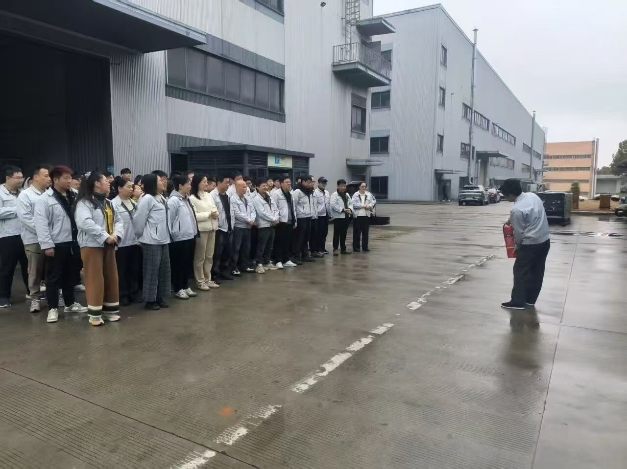 全体员工迅速响应有序疏散至厂房空地集合点。安全员现场讲解火灾应急疏散流程,并演示灭火器规范操作。多名员工踊跃参与实操演练,掌握灭火技能。